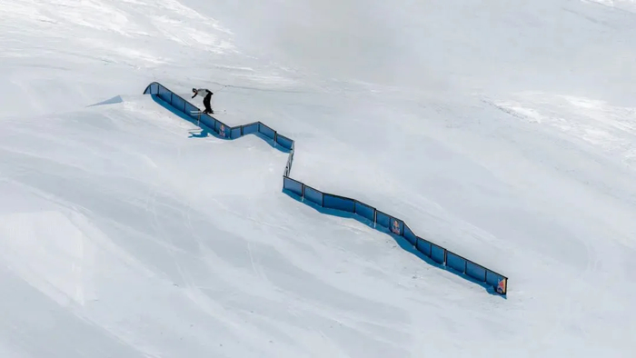 呲杆呲得不过瘾了!谢德(Tjäder)又玩起了“雪板过山车”,借助坡道腾空跃起,沿着未封闭圆形一侧轨道滑行,以倒挂金钟的姿势跃过长 3 米的间隙,又从相对而立的另一侧轨道滑下。
